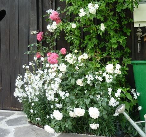 das kleine Rosenbeet vor einer Hütte gefällt mir nicht mehr- inzwischen wirkt es für mich unruhig und trotzdem fad.Im Hintergrund wächst Bobby James bis zum Dach, links davon ist Rosarium Uetersen bei einer Höhe von ca. 1 Meter und im Vordergrund Lions Rose und dazwischen die vielen weissen Glockenblumen . Die Glockenblumen sollen raus - aber was als Lückenfüller nehmen ? ich dachte an Gräser , einfach grün in grün um zu beruhigen oder wisst ihr etwas anderes ?das Beet liegt südöstlich und hat bis zum frühen Nachmittag Sonne , Boden humos