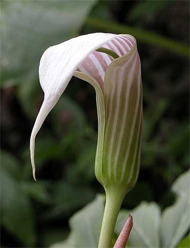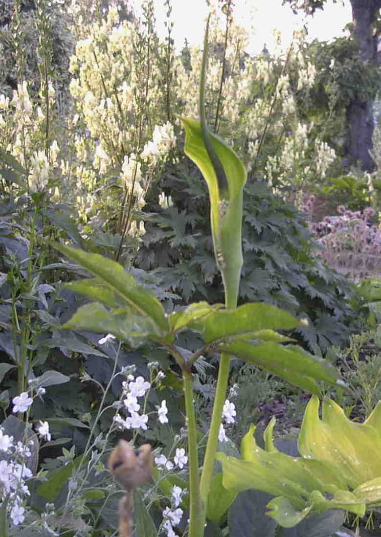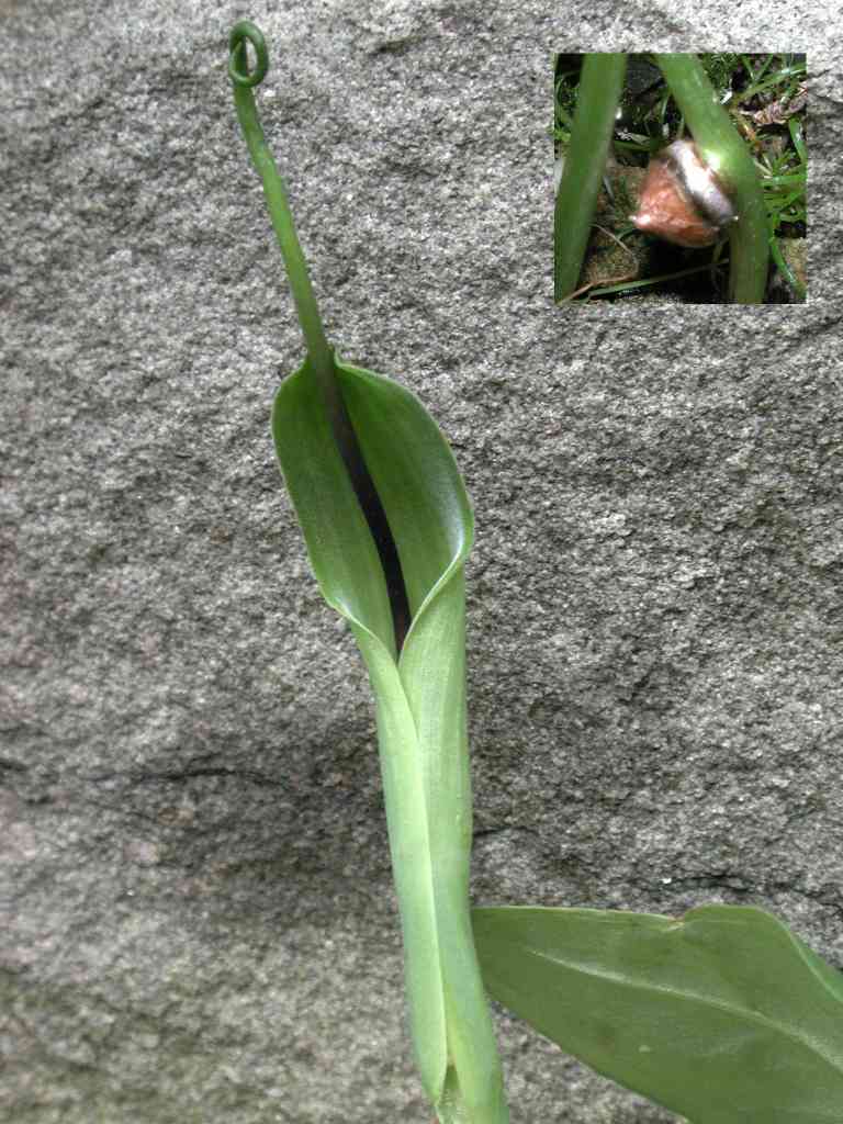 Es ist zwar kein Arisaema, aber nahe verwandt: Pinellia ternata mit seiner interessanten Spatha, die den verlängerten Spadix umschließt. Interessant ist bei dieser Art auch die Bildung von Bulbillen am unteren Blattstiel (kleines Bild). Ich halte die Pflanze zwar noch im Topf, sie ist aber voll winterhart.;)Ph.