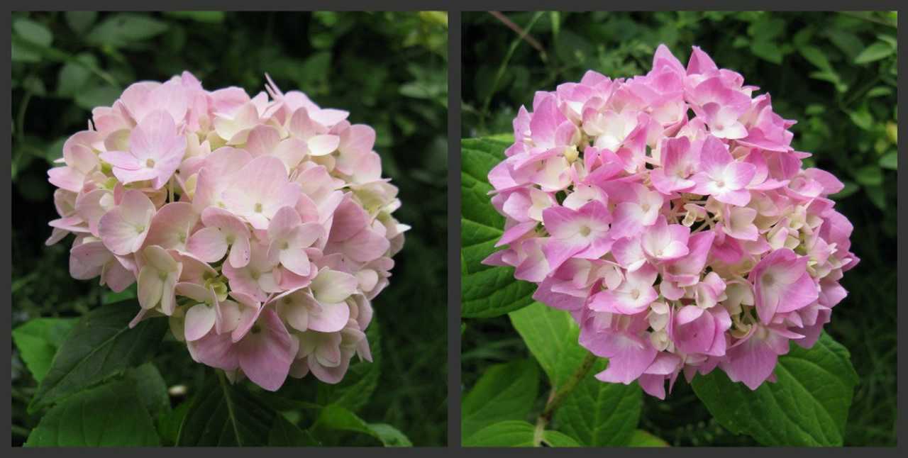 Hydrangea macrophylla 'Bailmer' (Endless Summer) identisch mit 'Semperflorens'?Noch zweifele ich daran. Die beiden Containerpflanzen nacheinander bei gleichem Licht fotografiert.Das Laub von 'Semperflorens' ist kleiner und dunkler. Das könnte ein Düngerproblem sein. Ich habe im Frühjahr in die selbe Erde umgetopft. 'Semperflorens aus einem 2 L Container, 'Bailmer' aus einem 9 cm Topf.Aber die Blütenfarbe? Die sollte doch eigentlich unabhängig von der Stickstoffversorgung sein.Beide Blüten sind ungefähr im selben Stadium
