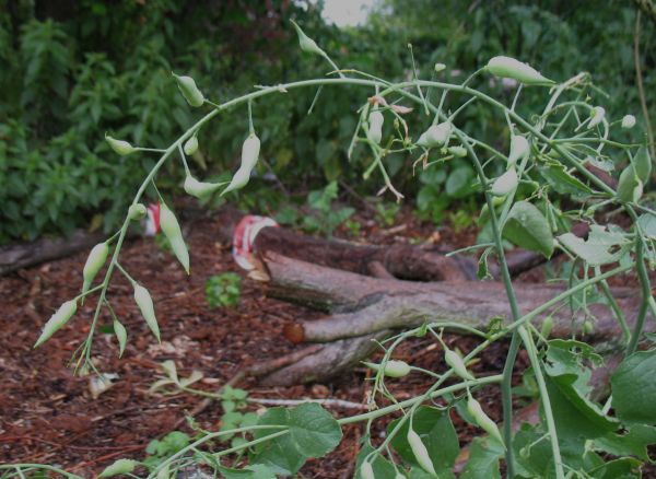 An einigen wilden Stellen unseres Gartens wachsen einige Ölrettichpflanzen. Sind wohl Reste einer Gründüngung vom Vorgänger.Seine Schoten haben wir heute geerntet und gegessen. Sie waren einfach zu pflücken, sehr sauber und daher schnell zu putzen.Sie schmeckten lecker, aber einige waren leider schon etwas zu reif, etwas strohig.