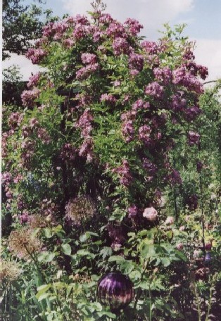 Also als Wucherteil kann ich meine Mme Plantier nicht bezeichnen, sie hat schon eine Weile gebraucht, bis sie in die Gänge kam. Das lag aber vermutlich auch daran, dass sie direkt neben einer Felsenbirne steht und sich erst durchsetzen musste. Meine Königin von Dänemark hat zwei-drei Jahre gebraucht, bis sie endlich richtig an Höhe zugelegt hat, jetzt ist sie ca. 1,5 m hoch aber so üppig, wie ich sie mir immer vorgestellt habe, wächst sie nach wie vor nicht.So ist das halt Martina, bei Dir tut sich Veilchenblau schwer, bei mir nicht, hier (wenn's auch etwas OT ist) mal ein Beweisfoto. ich muss sie jedes Jahr schneiden, damit es nicht überhand nimmt: