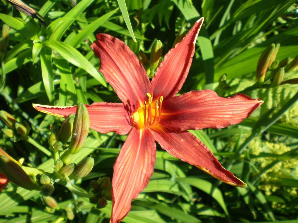 Hemerocallis "Crimson Pirate" paßt auch hier herein. Die Blüten haben keine Fernwirkung, aber aus der Nähe betrachtet, ist sie sehr hübsch.
