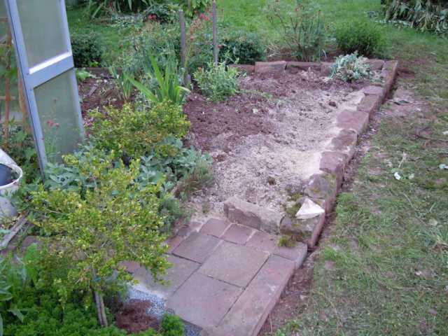 Nachdem der tägliche Regen nicht aufhören wollte, gings erst mal zwischendurch zu meiner Lieblingsgärtnerei, schon mal Pflanzengucken (und zum Aldi, einkaufen..übrigens dort Blaukorn von 3.99 auf 2,99 reduziert, 5Kg, gleich mal mitgenommen..)Nachdem der Regen immer wieder mal tröpfelte, es nicht kalt war, hab ich weitergewerkelt. Ein bißchen Pflastermosaik als Eintritt ins Gewächshaus, 5 Sack Spielsand und nen halben Sack Perlite reingeschafft, Unkraut raus, Astern raus, Meerkohlstrunk neu arrangiert (den hab ich dort letzte Woche nur eingeschlagen)...Und dann erst mal festgestellt, dass da noch ne Menge Sand und Splitt reinpasst