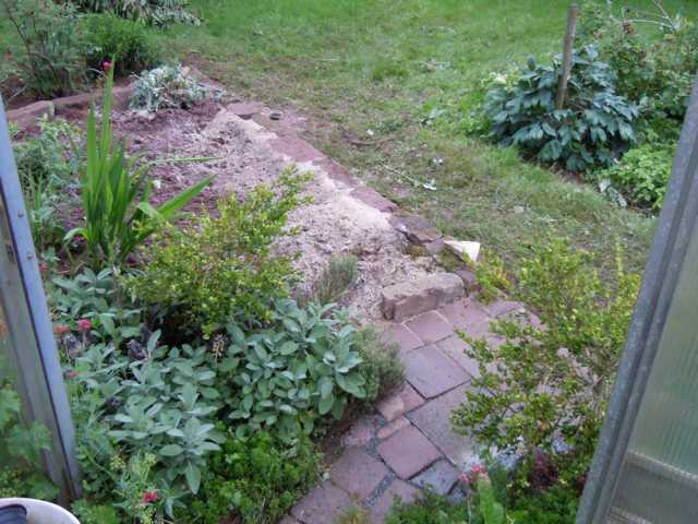 Nachdem der tägliche Regen nicht aufhören wollte, gings erst mal zwischendurch zu meiner Lieblingsgärtnerei, schon mal Pflanzengucken (und zum Aldi, einkaufen..übrigens dort Blaukorn von 3.99 auf 2,99 reduziert, 5Kg, gleich mal mitgenommen..)Nachdem der Regen immer wieder mal tröpfelte, es nicht kalt war, hab ich weitergewerkelt. Ein bißchen Pflastermosaik als Eintritt ins Gewächshaus, 5 Sack Spielsand und nen halben Sack Perlite reingeschafft, Unkraut raus, Astern raus, Meerkohlstrunk neu arrangiert (den hab ich dort letzte Woche nur eingeschlagen)...Und dann erst mal festgestellt, dass da noch ne Menge Sand und Splitt reinpasst