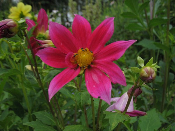 Hier ein eigener Sämling einer Mignondahlie. So dunkelrot war keine der aus einer Samenmischung stammenden Originale. Es scheint sich tatsächlich zu lohnen sich seine eigenen "Sorten" auszulesen, denn im Handel ist die Auswahl einfachblühender Dahlien nicht gerade groß. Ist mein Eindruck.