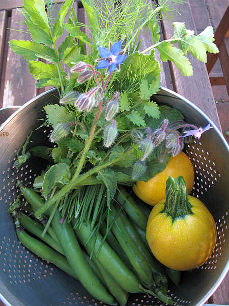 Habe heute die ersten dicken Bohnen, wieder kleine gelbe, runde Zucchini und ein Kräutersträußchen (Schnittknoblauch, Pastinak, Pimpinelle und Borretsch. Das Zitronenbasilikum war schon im Essen, hat mich aber sehr erfreut. Ich habe es heute zum ersten Mal gegessen und geerntet.