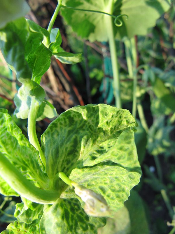 Sieht irgendwie bös virös aus... möglicherweise durch einen vorhergegangen Blattlausbefall übertragen?Bei samenübertragbaren Viren hättest du die Symptome schon deutlich früher sehen müssen.Tun würde ich gar nichts, wenn die Pflanze weiterhin tut wofür du sie bezahlt hast (nämlich Ertrag bringen) ist im Kleingarten alles bestens. Saatgut würde ich sicherheitshalber aber keins davon gewinnen.Hast du allerdings wertvolle Zierpflanzen in der Nachbarschaft stehen die zu den Leguminosen zählen wäre ich zumindest auf der Hut vor Blattläusen etc. und selbstverständlich nicht die gleichen Werkzeuge für Schnittmassnahmen einsetzen (aber warum sollte man Erbsen schneiden wollen?)....Liebe Grüsse,Daniel