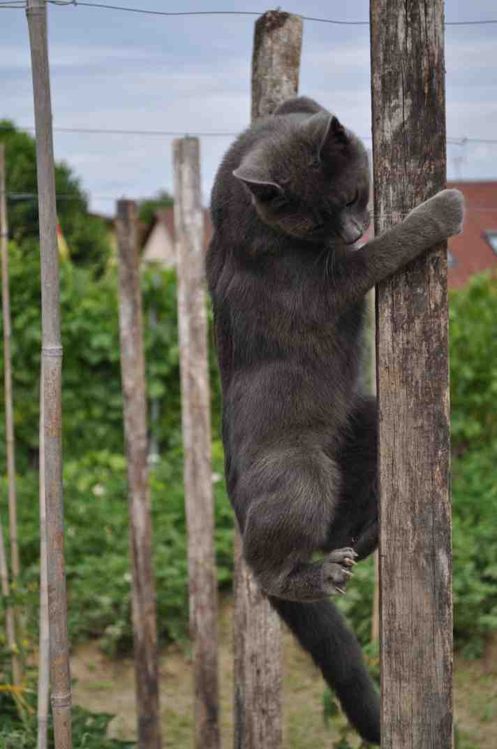 genau so! Oder noch besser, dass sie einem beim vorsichtigen drübersteigen, bevor man den nächsten Fuss auf die Erde setzt, so zwiechen den Beinen durchrennen, dass man ins straucheln gerät.Unsere Gimli hat einen neuen Sport:In der Drahtanlage für unsere Tomatenpflanzen liebt sie es, sämtliche Pfosten, die im Abstand von 7m stehen hochzulettern, Ausschau zuhalten, den Draht und Pfostenoberteil zu markieren und manchmal auch noch Kunsstückchen zu machen.Als ich die Kamera mal dabei hatte, hatte sie aber leider keine Lust zum rumalbernIch weiß, ich weiß. Man geht außenrum und wenn man oben ist, latschen zwei Katzenfratzen hinter einem her![]()