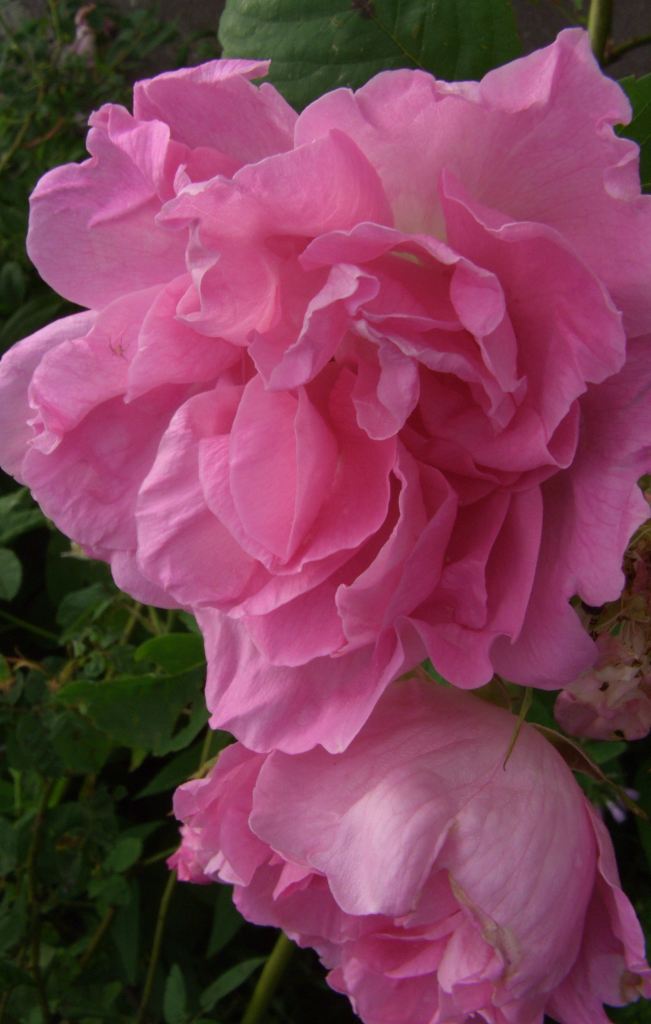 Fast wie eine große Wildrose (ich glaube, sie ist es auch, oder?) wirkt Rosa Morletti. Sie hat Gott sei dank keinerlei Stacheln. Im Winter sieht der Strauch mit seiner rötlichen Rinde auch sehr hübsch aus, fast wie Hartriegel.