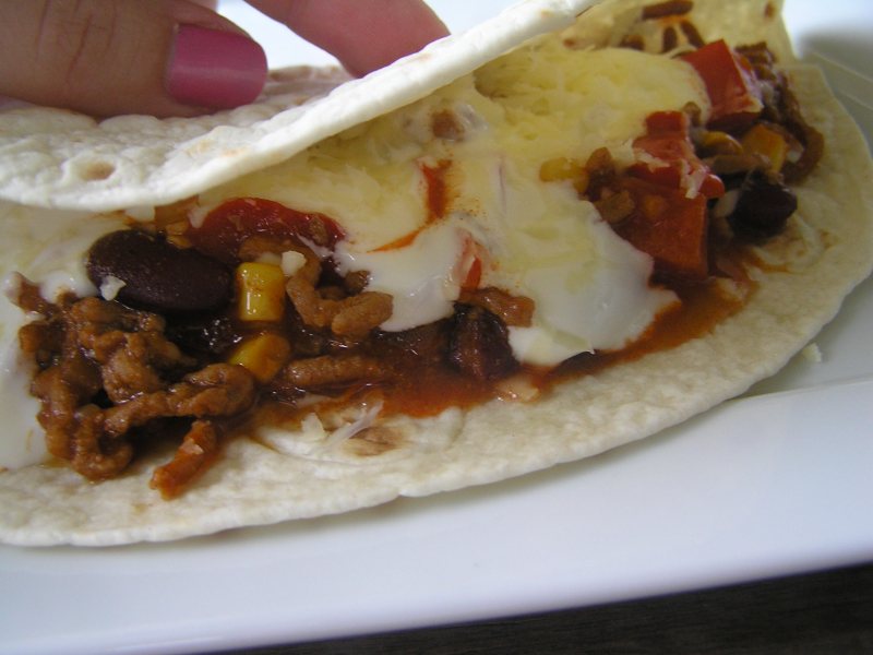 heute gabs chili con carne im tortilla mit sauerrahm und raspelkäse drüber