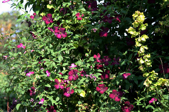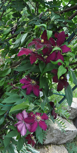 Die Clematis Niobe blüht sonst mit der Rose Shropshire Lass, zartes helles Rose zusammen. Das ergab jedesmal einen sehr schönen Kontrast. Die Rose ist aber seit mehr als drei Wochen vorbei. So blüht Niobe nun für sich allein.