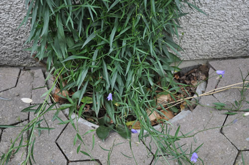 Dort ist auch das Loch zum Bepflanzen. Leider habe ich das beim Bau viel zu klein gemacht, eine halbe Zementröhre von 30 cm Breite, wie ein U an der Wand. Der Weg ist gepflästert, da ist nichts zu machen.
