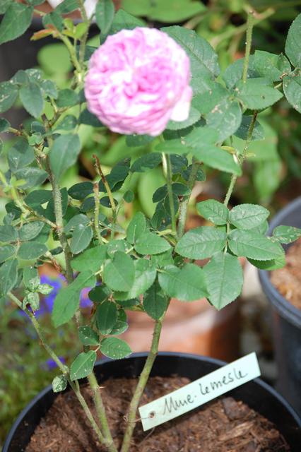 ?? Jetzt hab ich sie auch nicht gekauft, weil ich schon immer eine Mme Lemesle wollte - sondern weil sie mich an eine Portland erinnerte - hab sogar noch Raphaela zum Stand gezerrt und bin fünfmal drumrum geschlichen. Die Blätter sind recht klein, graugrün, Stacheln gibt es kaum, eher Borsten und ab und zu ein etwas größerer.