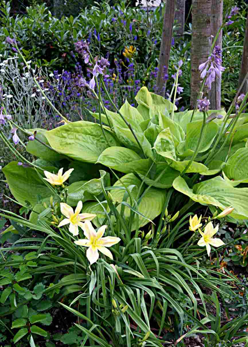 Hier ein Ausschnitt aus einem schon recht schattigen Beet, das zusätzlich unter sehr trockenem Boden leidet. Die Blüten des Hem-Sämlings sind hier deshalb deutlich kleiner als in den letzten beiden Jahren an besser versorgter Stelle, aber Sum & Substance stört das erstaunlicherweise überhaupt nicht - sie ist riesig!