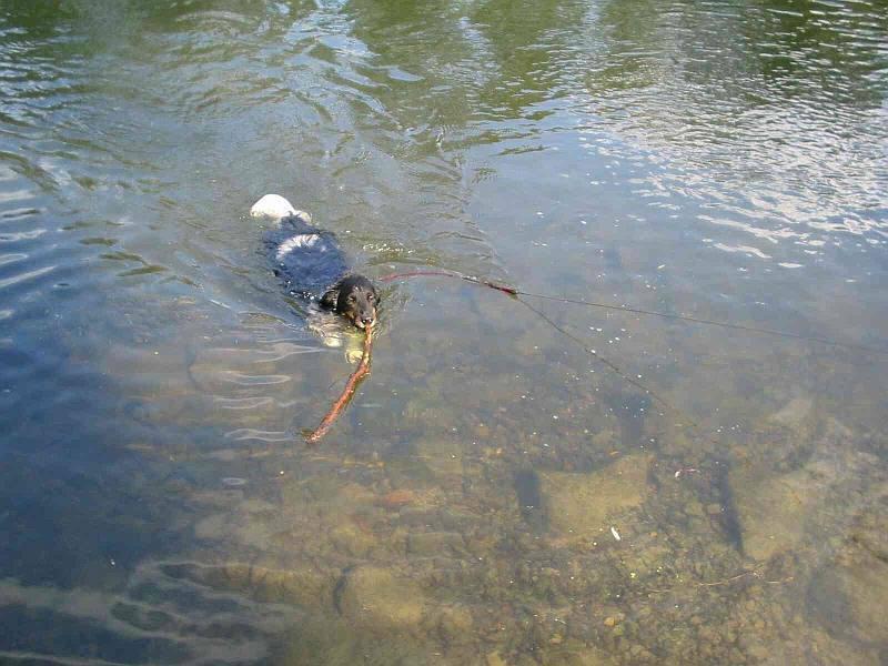 ! Und ganz rein geht er nur, wenn es richtig schön warm ist, sonst nur bis zur Stehhöhe, Stöcke muss man immer aus dem Bachlauf ziehen, Steinchen vom Grund fischen mit ganz untergetauchtem Kopf macht er auch gerne, da muss man beim Werfen nur auf die Zähne aufpassen, wenn er könnte, würd er die schon in der Luft schnappen. Dabei kann er ganz witzig unter Wasser aus der Nase schnorcheln