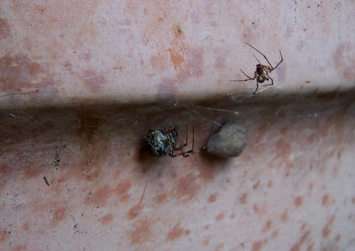 Hier eine andere Spinnenart. Ob es sich da um Männchen und Weibchen handelt? Also anstelle der kleineren Spinne würde ich machen, daß ich wegkomme!!