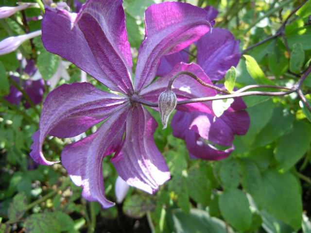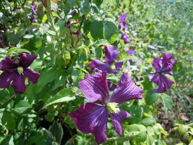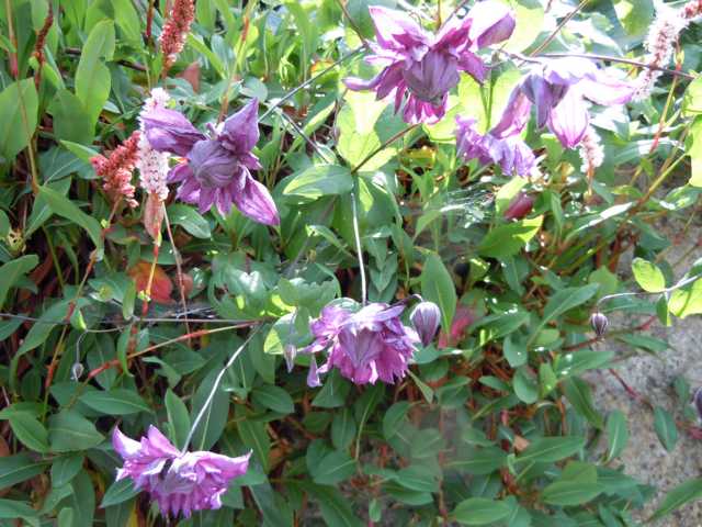 Clematis viticella "Mary Rose". Die etwas blauere und großblütigere Schwester von C.vit.purpurea plena elegans.