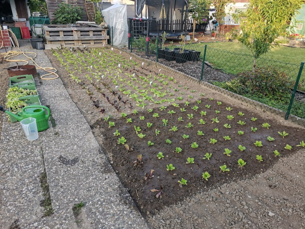 Was die Salate angeht, es sind 324 Stück. 252 um 20 Zuchtlinien zu sichten plus eine Kontrolle und 72 für den Düngerversuch mit der Kontrolle als Kontrolle.