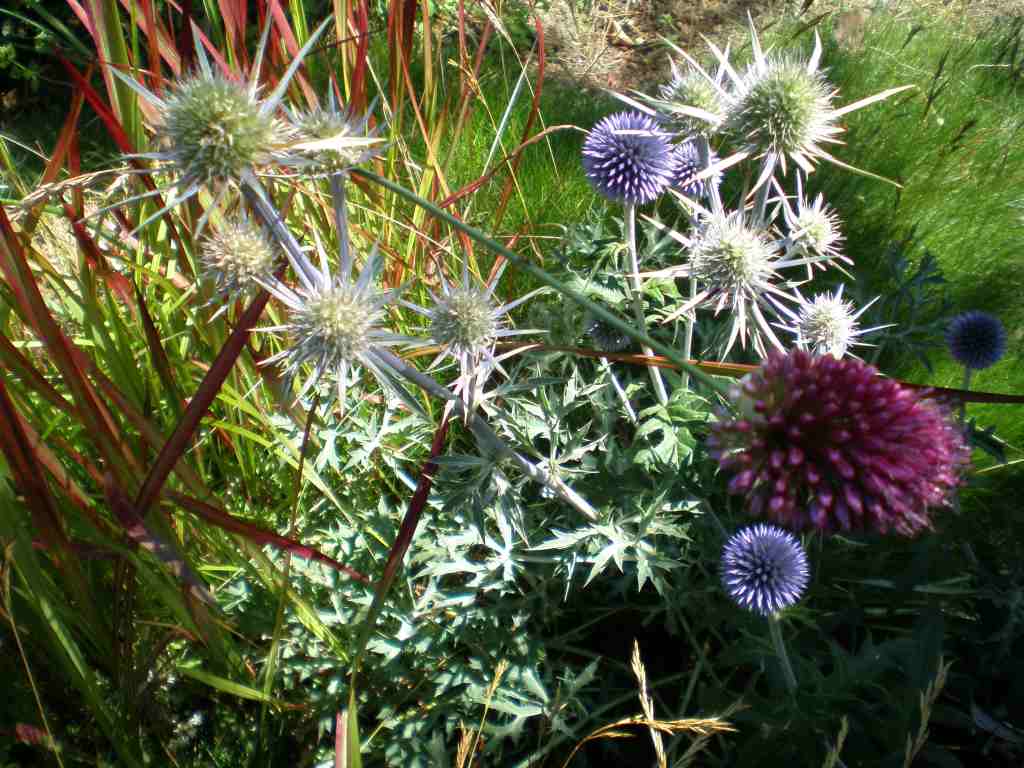 Dreierlei von der Kugel:Eryngium bourgatii, Echinops ritro und Allium sphaerocephalum.