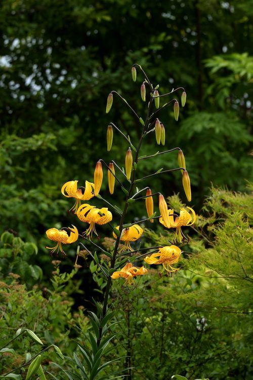 Lilium fargesii (grün, klein) ist nun aufgeblüht. Hier sieht man, wie klein sie im Vergleich zu L. henryi und L. leichtlinii ist.
