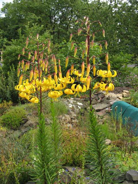 Dann ist es definitiv L.henryi, die hab ich mal gepflanzt vor ein paar Jahren. L. tigrinum aber auch ;)Sie sitzt nahezu in aufgefülltem Torf/Rindenkompost. Weil mein Boden so schwer ist, hab ich da mal ordentlich aufgefüllt (30 cm hoch). Und Schatten noch dazu. Normal hätt ich da früher NIE ne Lilie hingesetzt. Man lernt dazu ;DL.henryi ist doch eine Kletter-Lilie, oderMediteraneus wird henryi oder eine Hybride damit sein keinesfalls tigrinum.Die sind bekannt für ihre Standfestigkeit.
