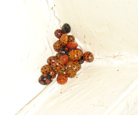 Hier war offensichtlich vor etwa einer Woche Schwarmtag. An 2-3 sonnigen Tagen gab es eine große Belagerung: Es sammelten sich immer mehr der asiatischen Marienkäfer an unseren Hauswänden (v.a. Süd- & Ostseite). Ich hab bewußt Fenster und Türen verschlossen, aber bei einem alten Haus finden sich immer genug Ritzen zum Durchschlüpfen. Jetzt sitzen sie in 3 Grüppchen in den Flurecken. Ich bin gespannt, ob es noch mehr werden...