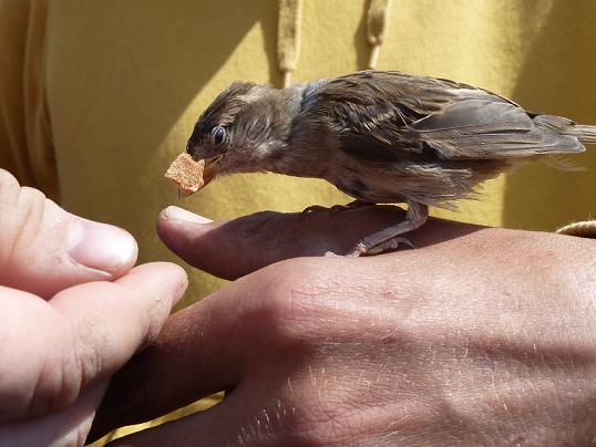 . Meinst Du wirklich, das es ein Spatz ist. Er hat einen sehr großen Schnabel finde ich. Vieleicht ist es doch ein anderer Vogel, vielleicht ausgebüchst aus einem Käfig, wo er die Handhaltung gewöhnt ist