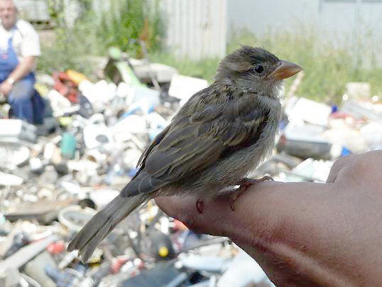 . Meinst Du wirklich, das es ein Spatz ist. Er hat einen sehr großen Schnabel finde ich. Vieleicht ist es doch ein anderer Vogel, vielleicht ausgebüchst aus einem Käfig, wo er die Handhaltung gewöhnt ist