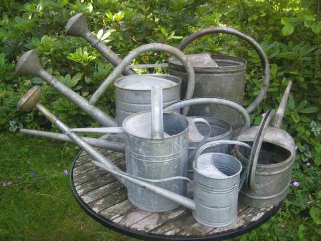 Meine Gießkannen-Parade: vorne zwei unbekannte, dann zwei Schneider-Gewächshauskannen 4,5 Liter (Brausen z. Z. nicht auffindbar), dann eine Fledermauskanne (BAT) 7,5 Liter und hinten die Schneiderkanne 12 Liter, die noch von meinem Großvater stammt und seit über 70 Jahren benutzt wird. Alle werden noch verwendet.