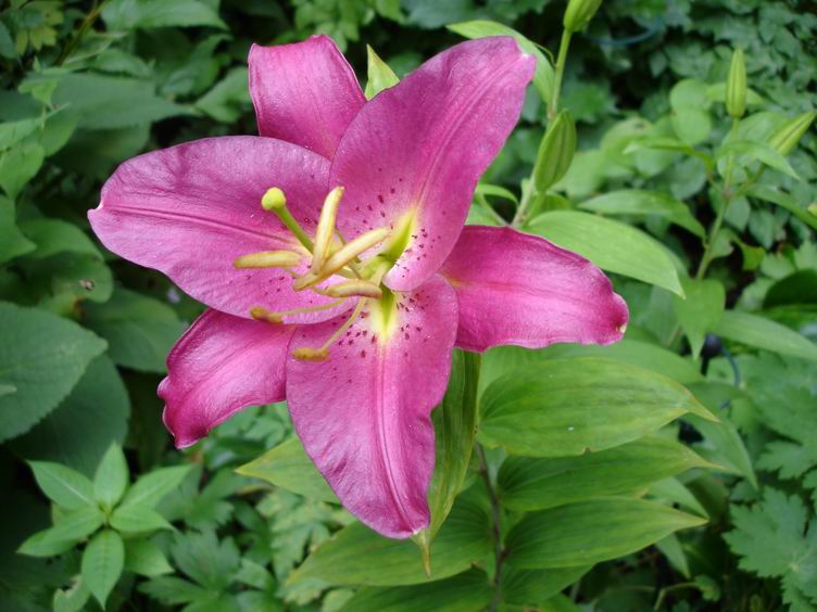 Vor einigen Jahren habe ich noch "Mischpackungen" verschiedener Lilien im Supermarkt mitgenommen, und dabei nur darauf geachtet, dass die Zwiebeln ordentlich aussahen. Natürlich kam nur ein Bruchteil von ihnen schon im ersten Jahr. Einige sind mittlerweile eh ganz weggeblieben, aber einige wenige haben sich nun in diesem Jahr doch zu einer (oder wenigen) Blüte(n) bequemt. Aber wie heißen die denn nun? Ausgehend von den etwas rundlichen, größeren Blättern meine ich, dass es Orientalis- oder OT-Hybriden sein müssten. Hier erstmal eine Rosafarbene, die auch etwas duftet:
