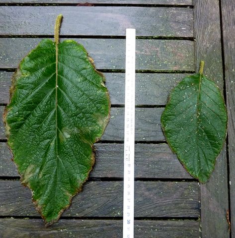 Hier auf die Schnelle ein Bild von den unterschiedlichen Blattgrößen.Links die Stammpflanze, rechts ihr Abkömmling, der inzwischen auch schon 1,80 m hoch ist.Die Unterschiede führe ich allein auf Standort- und/oder Bodenverhältnisse zurück.