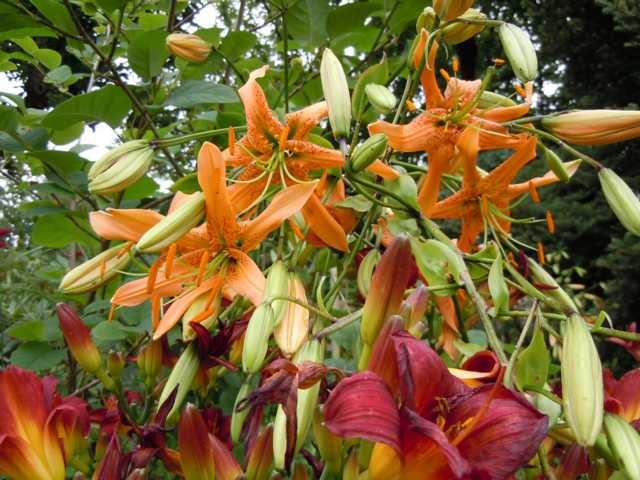 Die Kletterlilie L. henryi rambled (Rambler-Lilie ?) durch eine Magnolia sieboldii und hängt auf Hemerocallis "Little Joy" herab.