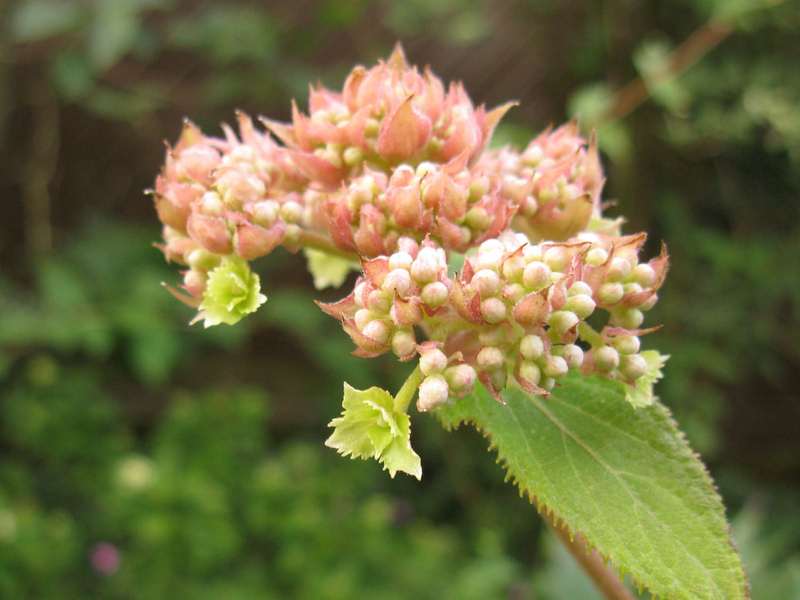 Meinst Du diesen jungen Trieb dicht am Stamm?Das ist schon H. sargentiana.Bei den Typen, die ich kenne, ist der Blütenstand, bis die sterilen Blüten sich öffnen, geschlossen und flach tellerförmig. (Die Erde ist eine Scheibe.