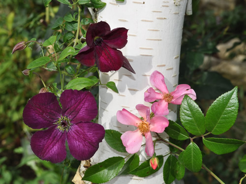 Carabea, hier das versprochene Foto.Plaisanterie, Clematis Viticella Royal Velours in der Himalaya-Birke.