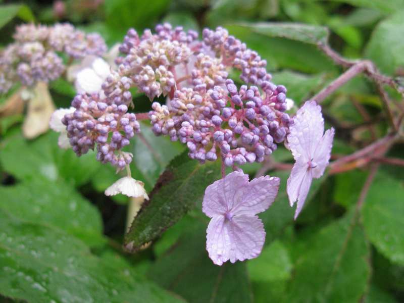 Hydrangea kawakamii (Hayata, J. Coll. Sci. Imp. Univ. Tokyo. 25: 90. 1908) siehe auch hier.Crug Farm Nurseries haben etliche Einführungen aus Taiwan mit Expeditionsnummer gelistet und drei Sorten ('August Abundance', 'Formosa' und 'September Splendour') gelistet.Meine Pflanze stammt von Esveld. Sie führen sie als Sorte 'Kawakamii', was ich für ein wenig unglücklich halte, da es offenbar doch mehr als einen Typ dieser aus Taiwan stammenden Rauhblatthortensie gibt.'Taiwan Pink' von Bulk/Niederlande gehört meiner Meinung nach auch in die "Kawakamii Group". Sie blüht etwas später als Esvelds 'Kawakamii' und die Blütenstande sind größer und lockerer (Bild folgt).