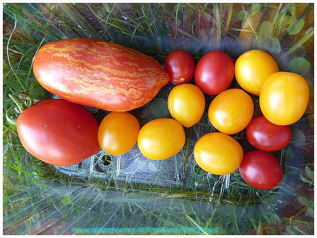 und gestern habe ich meine tomaten am spalier geerntet - casadys folly, pizzo tello, suesse friesin und kuestengold: