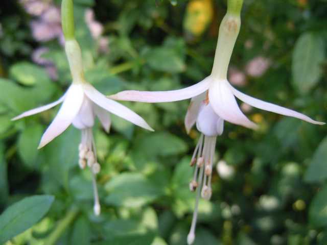 Reinweiß ist bei mir nur F. mag. "Hawkshead".Mir scheint, dass es sich bei marygolds Fuchsie um F. magellanica var. molinae handelt (So es denn tatsächlich dies Unterart gibt. Meine gehört/gelesen zu haben, dass es sich um eine Sorte handeln soll), da die Blüten einen zartrosa Anflug haben.F. magellanica "Alba" ist tasächlich rein weiß und eine Züchtung.Bei mir steht F. m. molinae voll schattig und blüht zufriedenstellend.