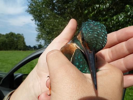 Wir hatten noch ein schönes Erlebnis am Freitag.Meine Tochter hat mich lauthals herbei gerufen und hatte etwas in der Hand. Es war ein Eisvogel. Sein Körper war verdreht und er hat die ganze Zeit seinen Kopf in 180 % hin und her bewegt. Wir denken das ener der Hunde im am Wickel hatte.Ein Nachbar aus dem Dorf hat meine Tochter samt Vogel zum Tierarzt gebracht. Der Nachbar sagte das er den letzten vor 30 Jahren sah und glaubte das es keine mehr in der Gegend gibt. Der Tierarzt hat ihn untersucht und gesagt er sei bis auf enen Schock in Ordnung. Nach ca. 2 h habene wir ihn dann am Waldrand freigelassen und er ist davon geflögen.Das war ein beeindruckendes Erlebnis.So einen Vogel in der Hand zu halten ist schon was.LG, Masche