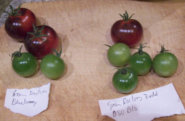 ich habe bei einem forums-mitglied die sorte osu blue gesehen. und bei einem anderen weitere "blaue" sorten.nebeneinander halten konnte ich sie leider nicht. aber meiner meinung unterscheiden sie sich hauptsaechlich durch die groesse des "blau-anteils" im oberen bereich, weniger durch die form und den (leider nicht allzu guten) geschmack.eine sorte mal ausgenommen, in die ich mich unsterblich vernarrt habe - blue wolly (link zum tomaten-atlas-eintrag).bezueglich der green doctors moechte ich doch nochmal kurz nachhaken. koennte es sein, dass die "frosetd"-variante, die ja durch eine mutation entstanden sein soll, bei eurem saatgut nicht vererbt hat? so dass es vielleicht gar nicht green doctors frosted ist oder zumindest nicht sortenrein