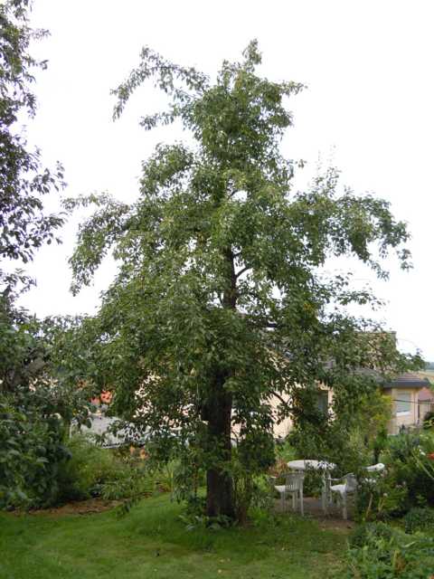 Der Baum. War vor 15 Jahren mal komplett bis zum untersten Ast zurückgeschnitten. Meine Großeltern hatten dem früheren Birnbaum Mostbirnen aufveredelt, weil die guten Birnen immer abhanden kamen.Wir haben deshalb einen Mostbirnbaum übernommen. Nur ein kleiner Zweig aus dem Stamm brachte gute Birnen. Aus diesem Zweig wurde ein neuer Baum aufgebaut. Es könnte deshalb auch eine Stammbildnerbirne sein.