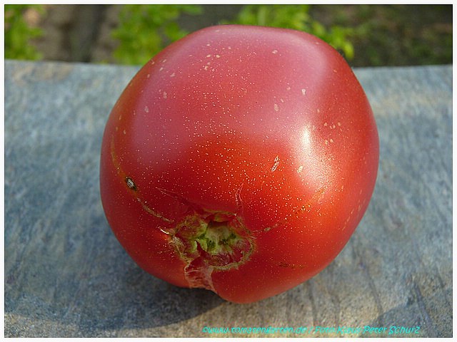 Dank dem Tomatenhaus ernte ich auch erstmals Fleischtomaten: Wilde Rose, 380 g, grinsend und mit Knubbelnase.