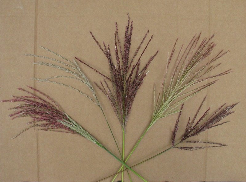 Eine kleine Auswahl an Miscanthus-Blütenähren. Von links:'Zwergelefant''Kleine Fontäne''Malepartus''Silberfeder''Ferner Osten'Interessanterweise wirken die Ähren der niedrigen Sorten 'Kleine Fontäne' und 'Ferner Osten' auf der Pflanze wesentlich voller.