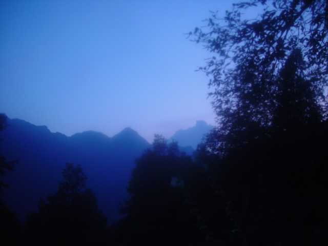 Ossola, Nordital.windstill, 20°C. an den Bergipfeln bilden sich vereinzelt Wolken, es wird wieder heiss heute
