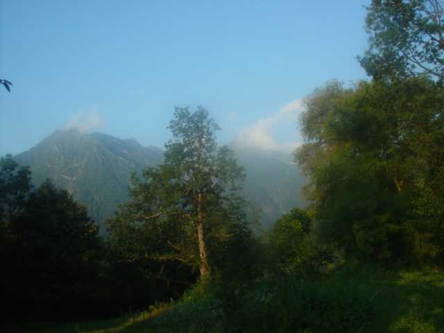 Ossola, Nordital.windstill, 20°C. an den Bergipfeln bilden sich vereinzelt Wolken, es wird wieder heiss heute