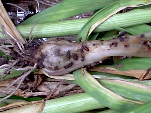 Hallo,jetzt weiß ich warum mein Knoblauch langsam braun wird. ::)Da hat sich von oben was nach unten durchgefressen bis in die Knollen ( "Knöllchen" ) hinein. Sieht aus wie rote kleine Reiskörner.Hab ein Bild gemacht, ich bekomme es einfach nicht richtig scharf, aber vielleicht kann trotzdem jemand erkennen was das ist.Gruß Karin