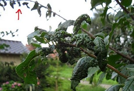 Zwetsche Nahaufnahme -- Kräuselkrankheit?Im Hintergrund (Pfeil) auch zu sehen: Die neuen, langen Triebe wachsen bei Erkrankung oft in leichten Wellen