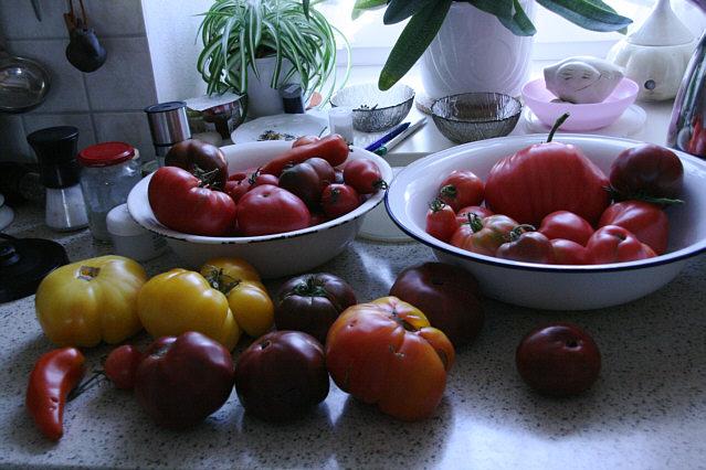 Gestern habe ich Tomaten nach elis' Rezept eingekocht, die doppelte Menge von denen auf dem Bild.Sind 15 400-ml-Gläser geworden. Das wird wohl der Weg sein, den alle unsere Tomaten gehen, es bleibt wenig zum frisch Essen - die Braunfäule hat nun auch uns voll im Griff. Trotz Tomatenhaus - die Luftfeuchtigkeit tut ihren Teil.