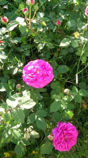 Könnte dies eine Rosa gallica-Sorte sein? Oder die Apothekerrose? Bei mir steht auch so ein halbhoher Strauch, die bekam ich als Apothekerrose.