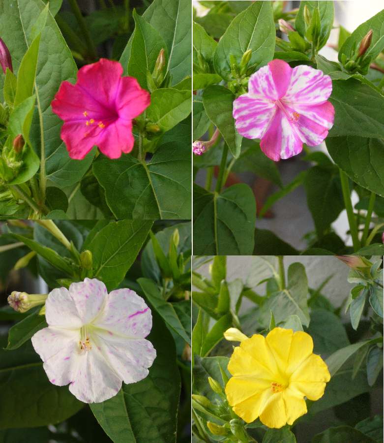 Ich habe mich mal an einer Collage mit den verschiedenen Wunderblumen versucht, die derzeit im Balkonkübel blühen.