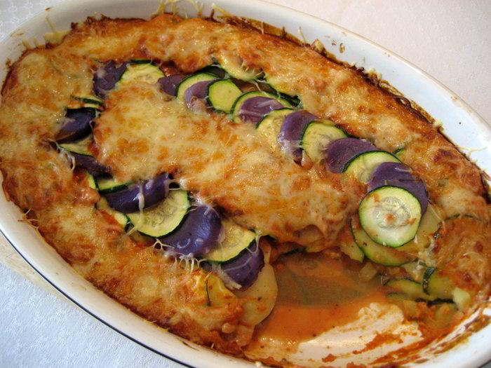 Und weil von gestern Abend (8 Sorten Pellkartoffeln (eigener Anbau) mit Kräuterquark) noch so viele Kartoffeln über waren, habe ich sie heute Mittag verarbeitet zu:Überbackener Kartoffel-Zucchini-Auflauf mit Tomaten-Sahne-SoßeLieber das Foto vom Auflauf als eines vom Durcheinander auf dem Teller...